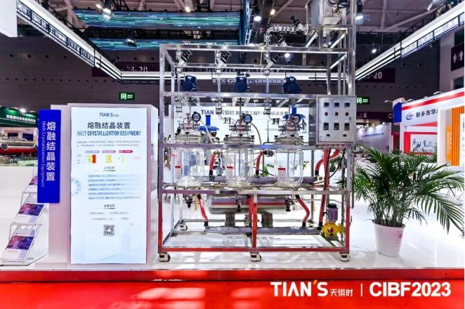 合而共贏,方能健步前行。在本次展會中,天俱時集團展位還展出了戰略合作伙伴重慶敏恒科技有限公司所帶來的熔融結晶裝置與分子蒸餾裝置。其中,熔融結晶裝置相較于傳統列管結晶可節省占地面積與投資成本,提升效率,并且產品純度最高可達99.9999%,廣泛應用于VC/FEC等添加劑領域。分子蒸餾裝置可使液體在遠低于沸點的溫度下分離,并且受熱時間短,分離程度高,可做到連續流,特別適用于熱敏性物質的蒸餾提純。