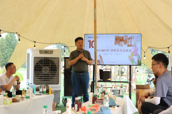 飛盤嘉年華活動結束后,2024屆天俱時10+學生會入會儀式隆重舉行,伴隨著全新的會員手冊及優美的會歌旋律,天俱時集團董事長,10+學生會名譽主席劉金濤進行開幕致辭。他首先表示天俱時10+學生會成員既是企業業務的精英,更是企業文化傳承的載體。作為10+學生會的一員,他倍感自豪。之后,他從天俱時的組織建設理念、業務經營新模式等方面進行了詳細地介紹,并表示所有10+學生會成員都是未來天俱時前行中的主角,希望與大家一同發光發熱,為共同的事業而奮斗。